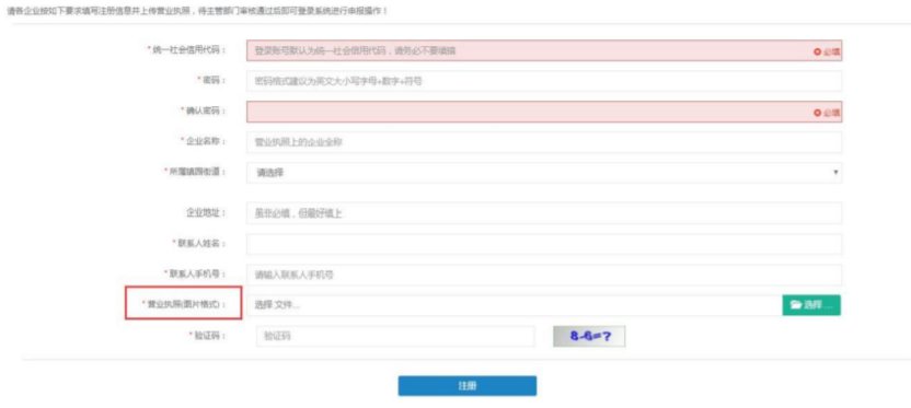 按页面提示填写企业、联系人信息,上传营业执照扫描件(图片格式),输入验证码后点击【注册】按钮,完成企业注册。注:企业提交注册后需等人社局主管科室审核通过后才能登录。