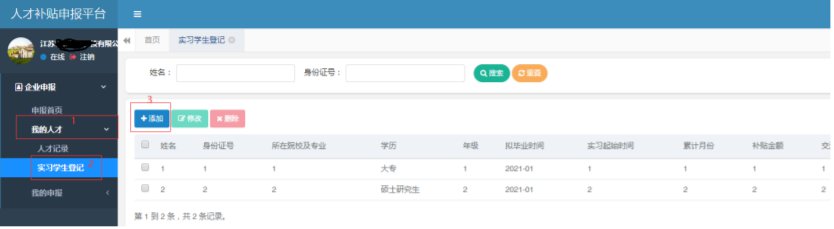 (1)实习学生登记点击【我的人才】【实习学生登记】进入实习学生列表,点击添加按钮,添加实习学生。