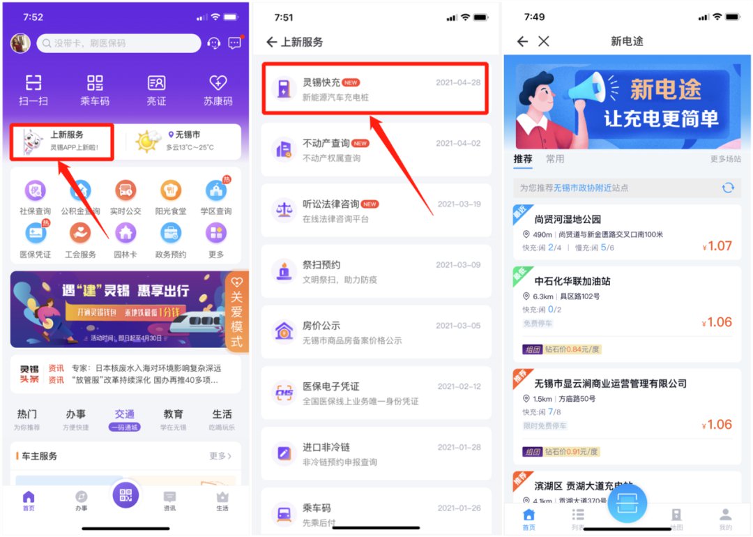 “灵锡”APP 上新“灵锡快充”版块,接入的是朗新科技旗下的新能源汽车“聚合充电”——“新电途”平台,覆盖无锡市1000多个公共充电桩 , 使用“灵锡”APP即可查询充电桩地址、扫码充电、即插即充。