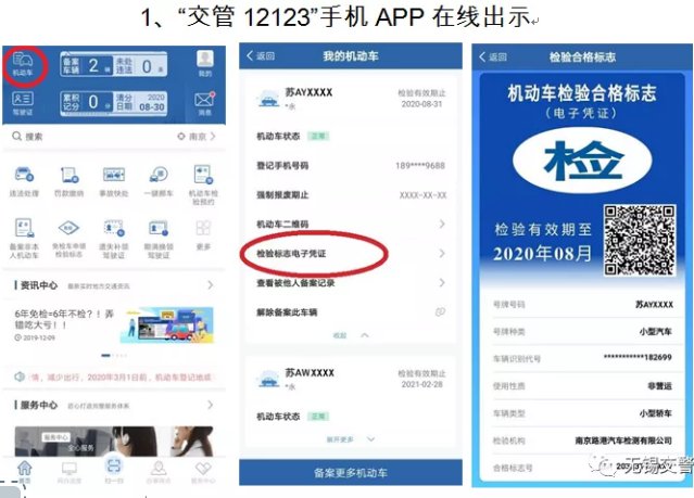在线出示时,市民可以直接登录“交管12123”手机APP,实时在线查询、出示本人名下或本人已备案机动车的检验标志电子凭证。