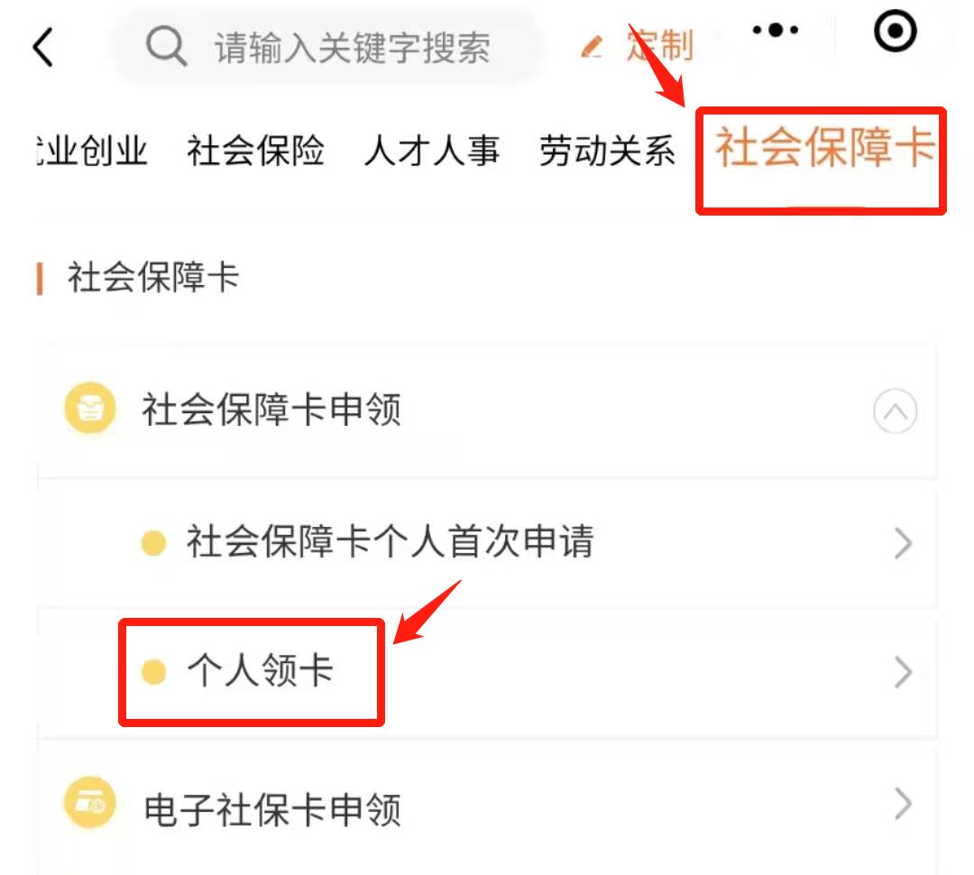 第三步:选择“社会保障卡申领”-“个人领卡”中完成确认。