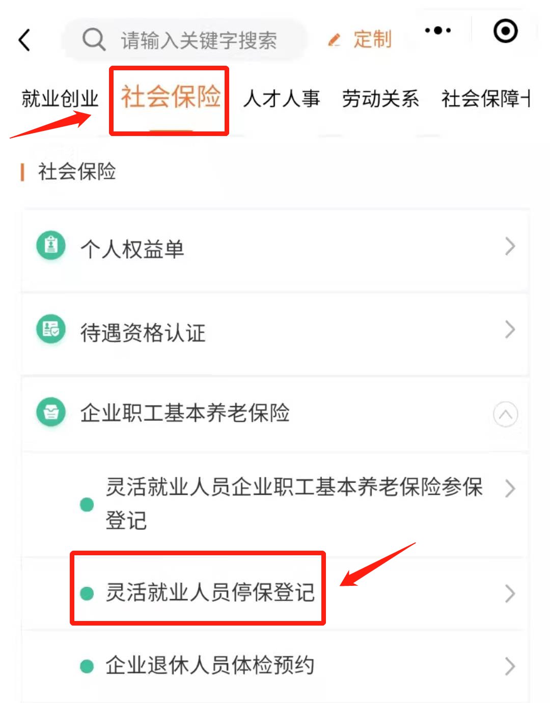 第三步:选择“全部”-“社会保险”-“灵活就业人员停保登记”-“灵活就业人员停保登记”中申请办理
