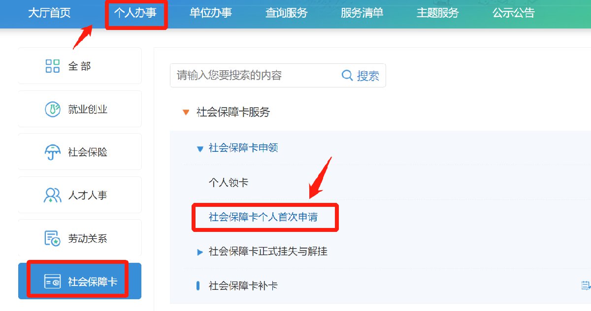 第三步:选择“个人办事”,选择“社会保障卡”——点击“社会保障卡申领”,点击“社会保障卡首次申领”
