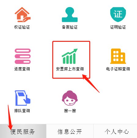 2、点击“安置房上市查询”中查询能否上市;若查询无结果,请向安置单位咨询。