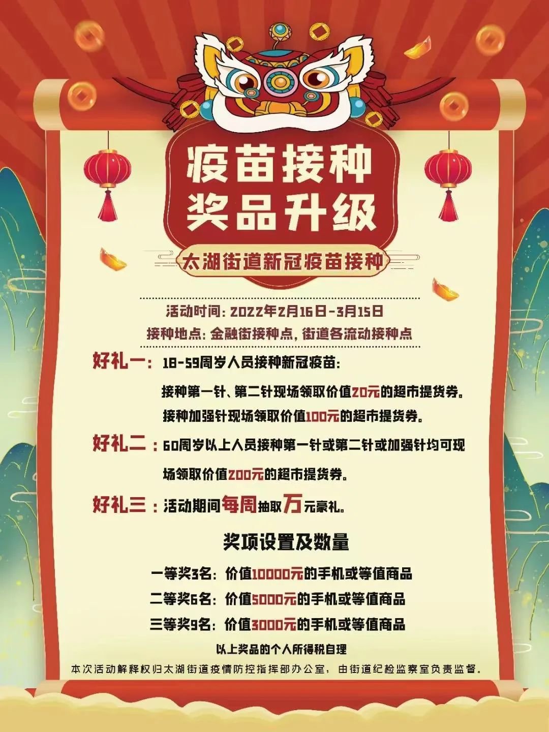 第一针、第二针、第三针(加强针)均可接种,18-59周岁人员接种第一针、第二针现场有2桶稻米油赠送,接种加强针现场领取100元超市提货券;60周岁以上人员接种第一针或第二针或加强针均可现场领取200元超市提货券。