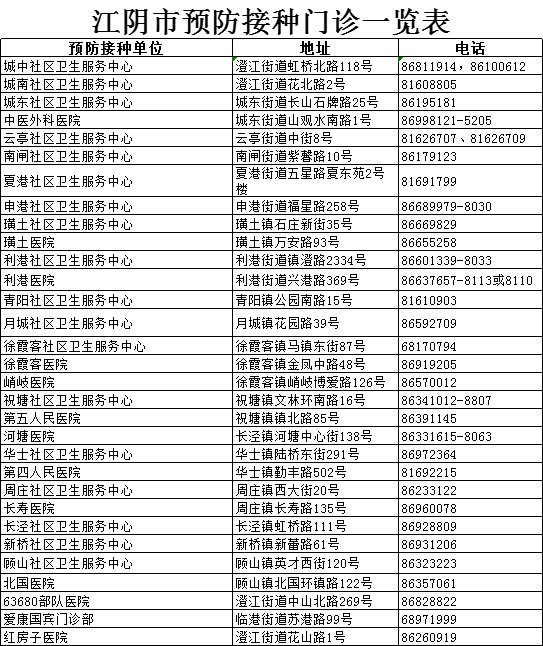 江阴疫苗预防接种门诊地点及电话汇总: