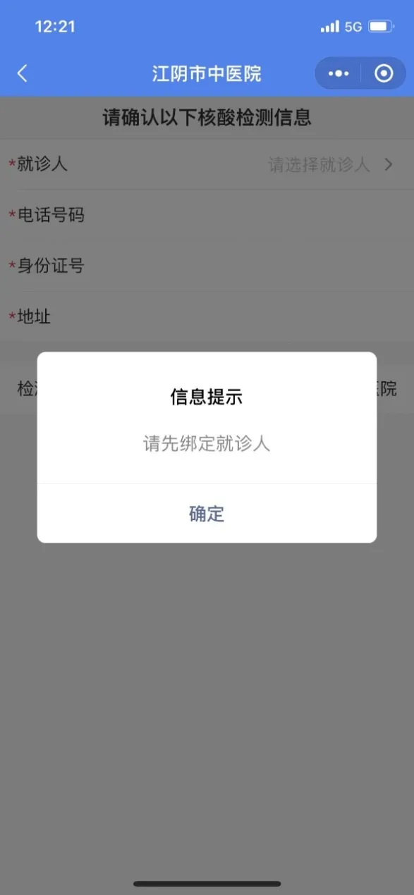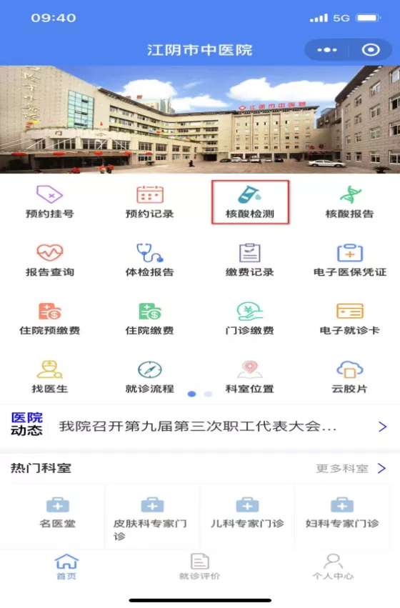 为减少人员聚集和缩短等候时间,江阴市中医院小程序提供一键核酸自主申请、缴费(暂不支持医保结算)功能。