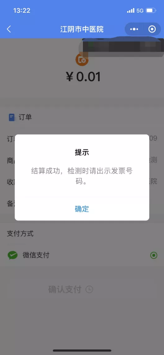 结算成功,系统自动打开详情信息页面,来院采样时出示发票条码信息。