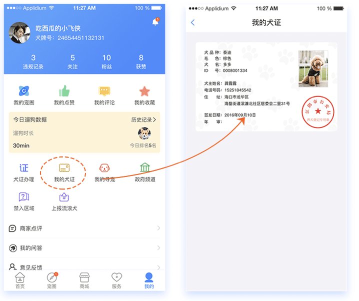 3、登陆犬卫士app,点击我的犬证,即可查看电子犬证
