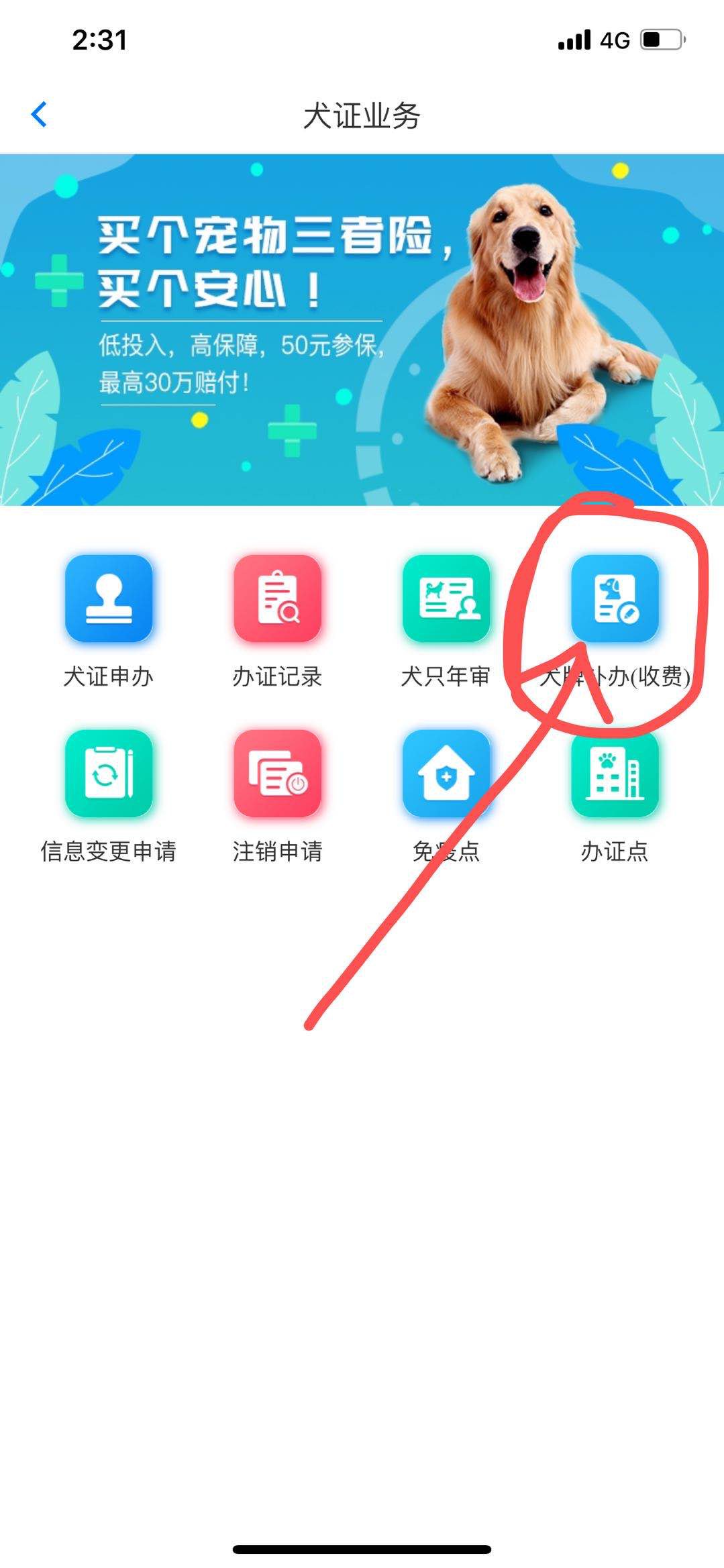 4、点击“犬证补办”