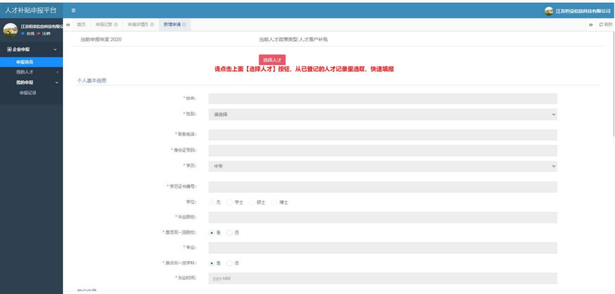 (1)申报提交点击首页【人才落户补贴】图标,进入人才落户补贴申报页面点击【选择人才】,选择人才信息,自动引入个人基本信息。单位名称、联系人、联系电话已从企业注册信息中引入,不需填写,其他字段按要求填写。