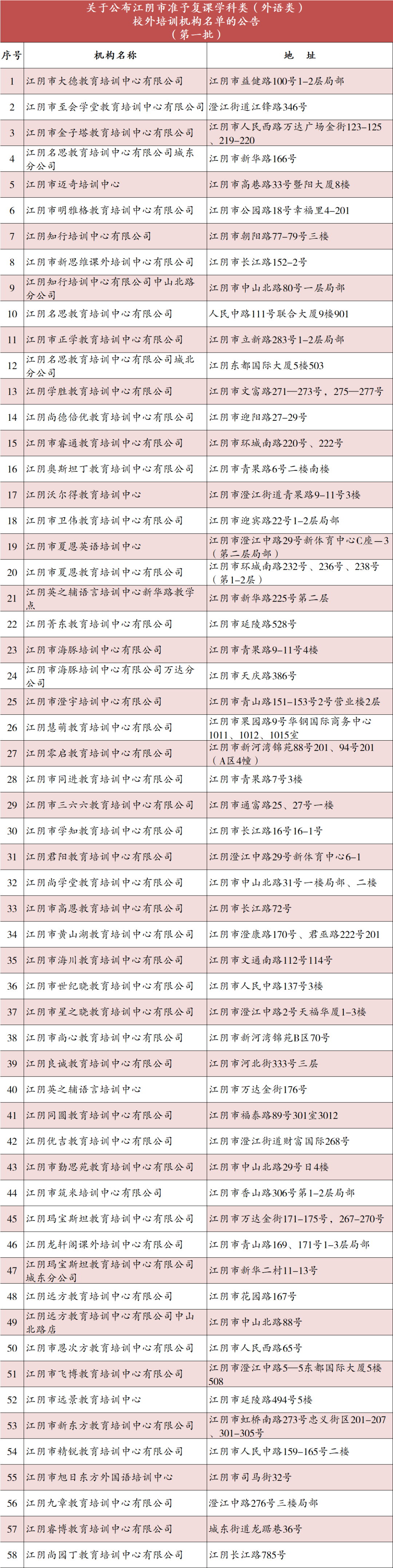 《关于公布江阴市准予复课学科类(外语类)校外培训机构名单的公告(第一批)》