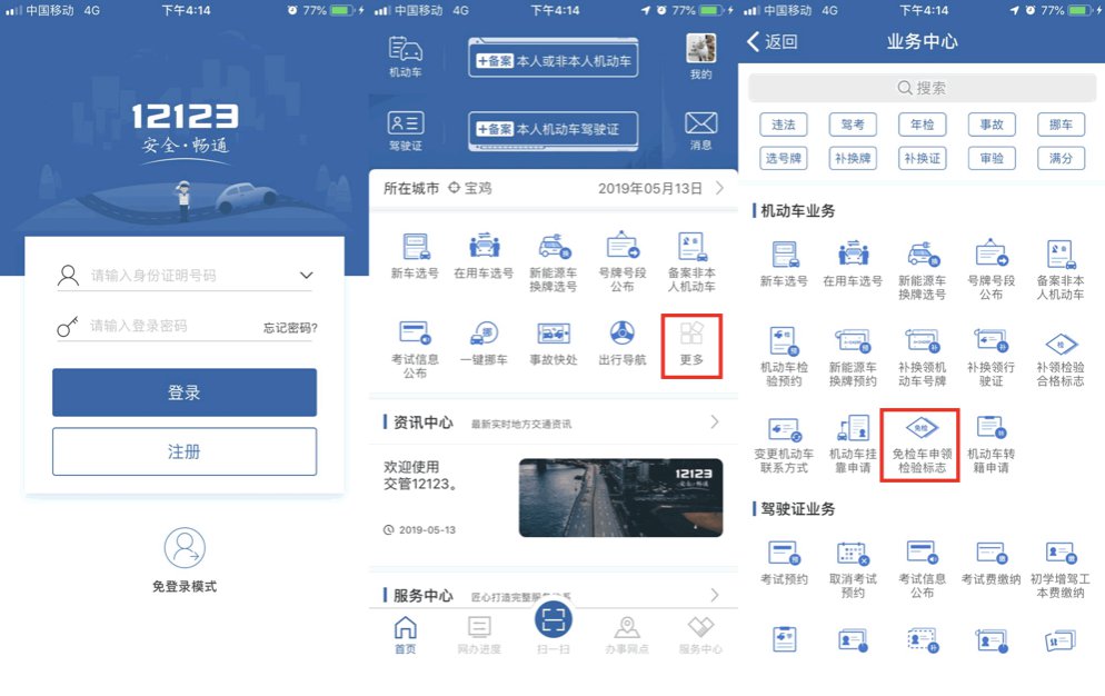第一步、登录"交管12123"APP后,通过【业务中心】→【免检车申领检验标志】,进入免检车申领检验标志业务流程,用户可以为已备案的本人机动车免检车申领检验标志。