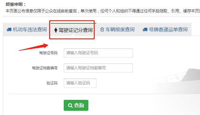 点击【驾驶证记分查询】,输入驾驶证号码、驾驶证档案编号、验证码即可查询。