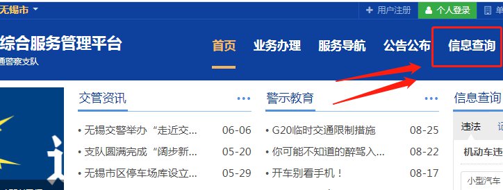 第一步:进入交通安全综合管理服务平台,选择无锡,具体网址:https://wux.122.gov.cn/,点击首页导航栏“信息查询”