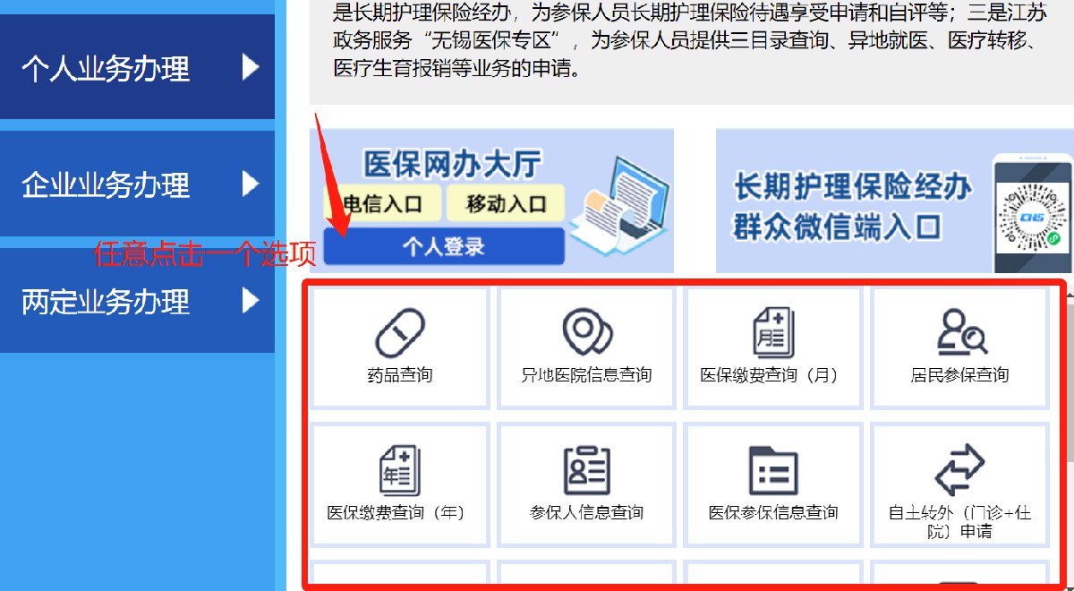 第二步:选择“个人办事”,随意点击“查询页面”(如药品查询、医保缴费查询等)