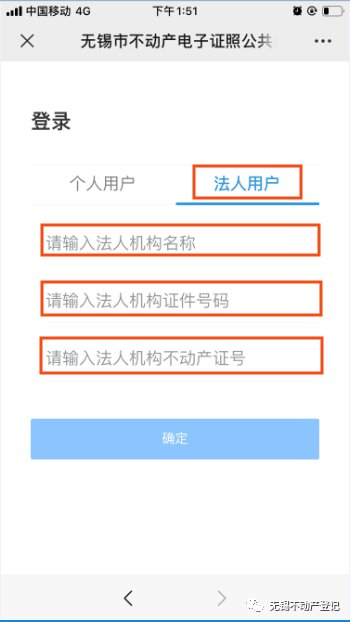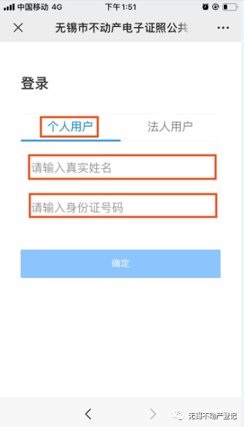 5、进入登录页面,根据用户类型选择个人用户或者法人用户,个人用户根据提示输入权利人“真实姓名”和“身份证号码”,点击“确定”,系统会对权利人进行“实名认证”。法人用户根据提示输入“法人机构名称”、“法人机构证件号码”和“法人机构不动产证号”,点击“确定”,系统对信息进行验证。