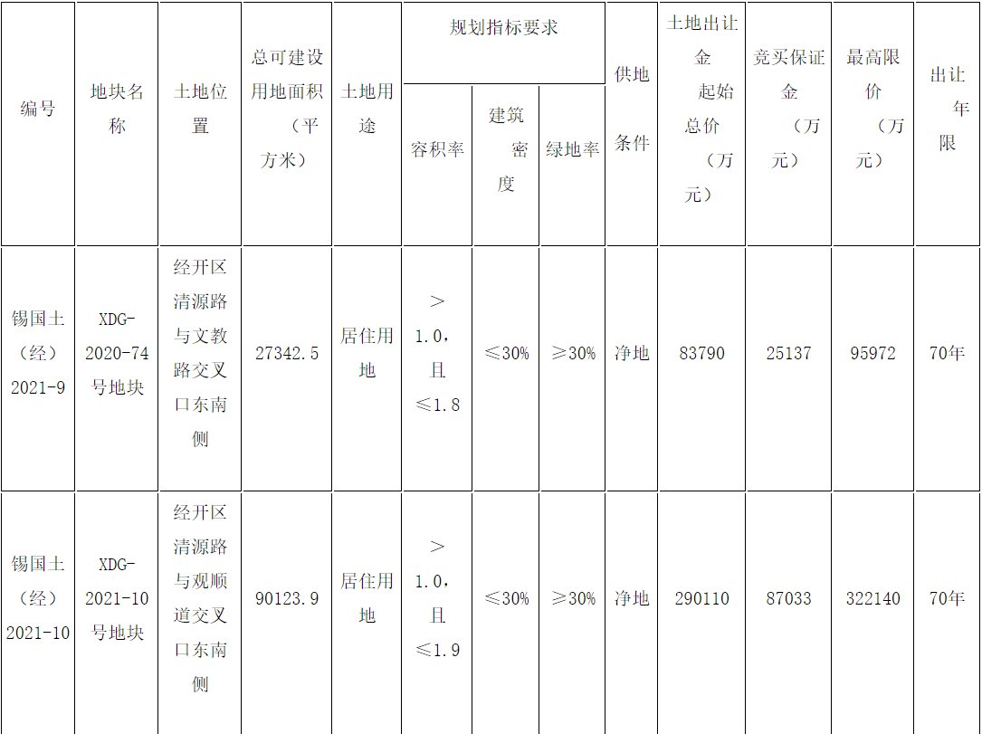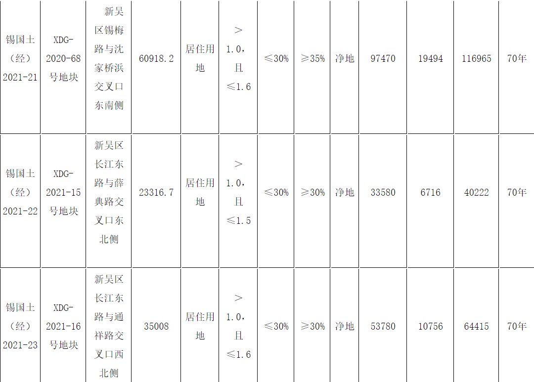 本次国有建设用地使用权挂牌出让采取在互联网上交易的方式,即通过无锡市国有建设用地使用权网上交易系统进行。锡国土(经)2021-9地块土地估价报告备案号为3202921BA0197,达到最高限价的轮次为61轮。锡国土(经)2021-10地块土地估价报告备案号为3204221BA0259,达到最高限价的轮次为65轮。锡国土(经)2021-12地块土地估价报告备案号为3204221BA0133,达到最高限价的轮次为46轮。锡国土(经)2021-13地块土地估价报告备案号为3204621BA0033,达到最高限价的轮次为35轮。锡国土(经)2021-14地块土地估价报告备案号为3209620BA0036,达到最高限价的轮次为40轮。锡国土(经)2021-15地块土地估价报告备案号为3204220BA0779,达到最高限价的轮次为41轮。锡国土(经)2021-16地块土地估价报告备案号为3203821IA0140,达到最高限价的轮次为40轮。锡国土(经)2021-17地块土地估价报告备案号为3204621BA0032,达到最高限价的轮次为35轮。锡国土(经)2021-18地块土地估价报告备案号为3203821IA0052 ,达到最高限价的轮次为37轮。锡国土(经)2021-19地块土地估价报告备案号为3209621BA0004,达到最高限价的轮次为100轮。锡国土(经)2021-20地块土地估价报告备案号为3203821IA0141,达到最高限价的轮次为66轮。锡国土(经)2021-21地块土地估价报告备案号为3203820IA0671,达到最高限价的轮次为65轮。锡国土(经)2021-22地块土地估价报告备案号为3203821IA0142 ,达到最高限价的轮次为34轮。锡国土(经)2021-23地块土地估价报告备案号为3202921BA0364,达到最高限价的轮次为54轮。锡国土(经)2021-24地块土地估价报告备案号为3204621BA0034 ,达到最高限价的轮次为55轮。锡国土(经)2021-25地块土地估价报告备案号为3204220BA0863,达到最高限价的轮次为65轮。
