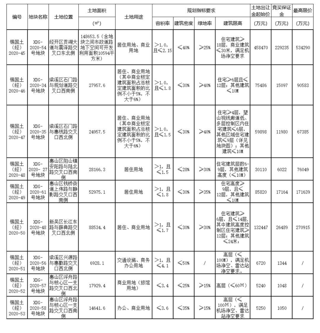 10月28日,锡经告字[2020]9号公告将集中出让9宗经营性用地,其中6宗涉宅用地总出让面积36.07万㎡,起拍总价约84.22亿元。