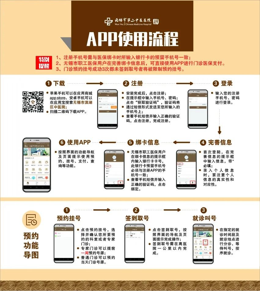 下载“无锡市滨湖区中医院”掌上APP;苹果手机用户通过手机商店、安卓手机用户通过“应用宝”搜索“无锡市滨湖区中医院”下载。