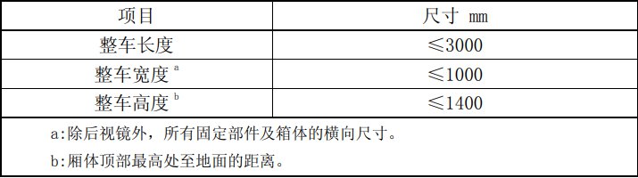 快递三轮车主要尺寸限值应满足下表的规定: