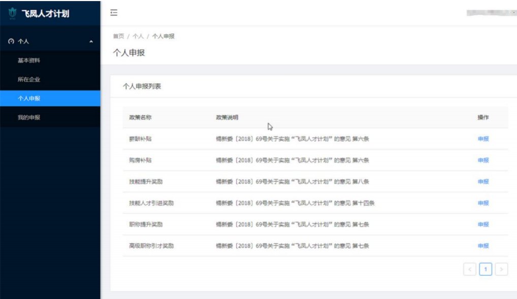 (4)个人开始申报个人通过企业审核,且满足申报条件后,选择需要申报的项目,点击“申报” 进入政策说明,同意说明条款确认后进入申报页面。
