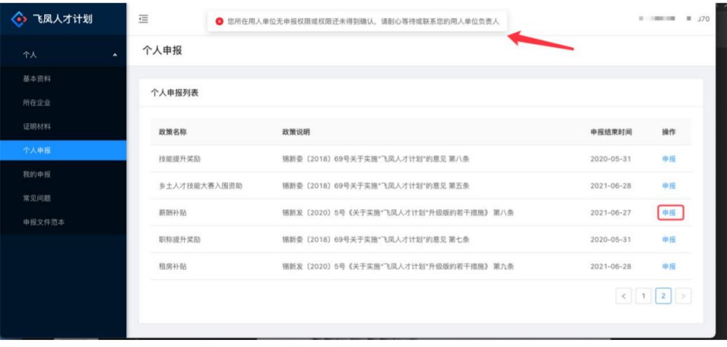 若用人单位未申报或未通过企业申报资质确认,个人用户点击“薪酬补贴”、“租房补贴”政策申报时,则会提示如上信息,请耐心等待或联系用人单位负责人。
