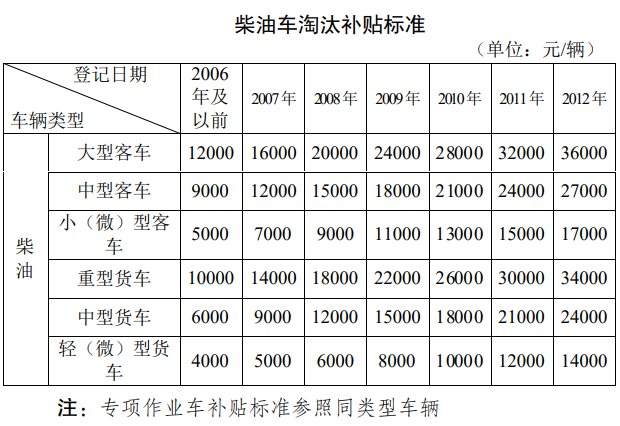 根据车辆类型、登记年限,实施差别化补贴标准,具体见 下表。不同年度淘汰车辆的补贴金额=补贴标准*系数。2020 年淘汰的,系数为 1.3;2021 年淘汰的,系数为 1.2;2022 年淘汰 的,系数为 0.5。