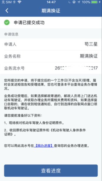 完成期满换证业务申请信息提交后,您可通过【首页】->【网办进度】功能随时查看业务办理进度,网办中心工作人员将在1个工作日内受理您的业务。