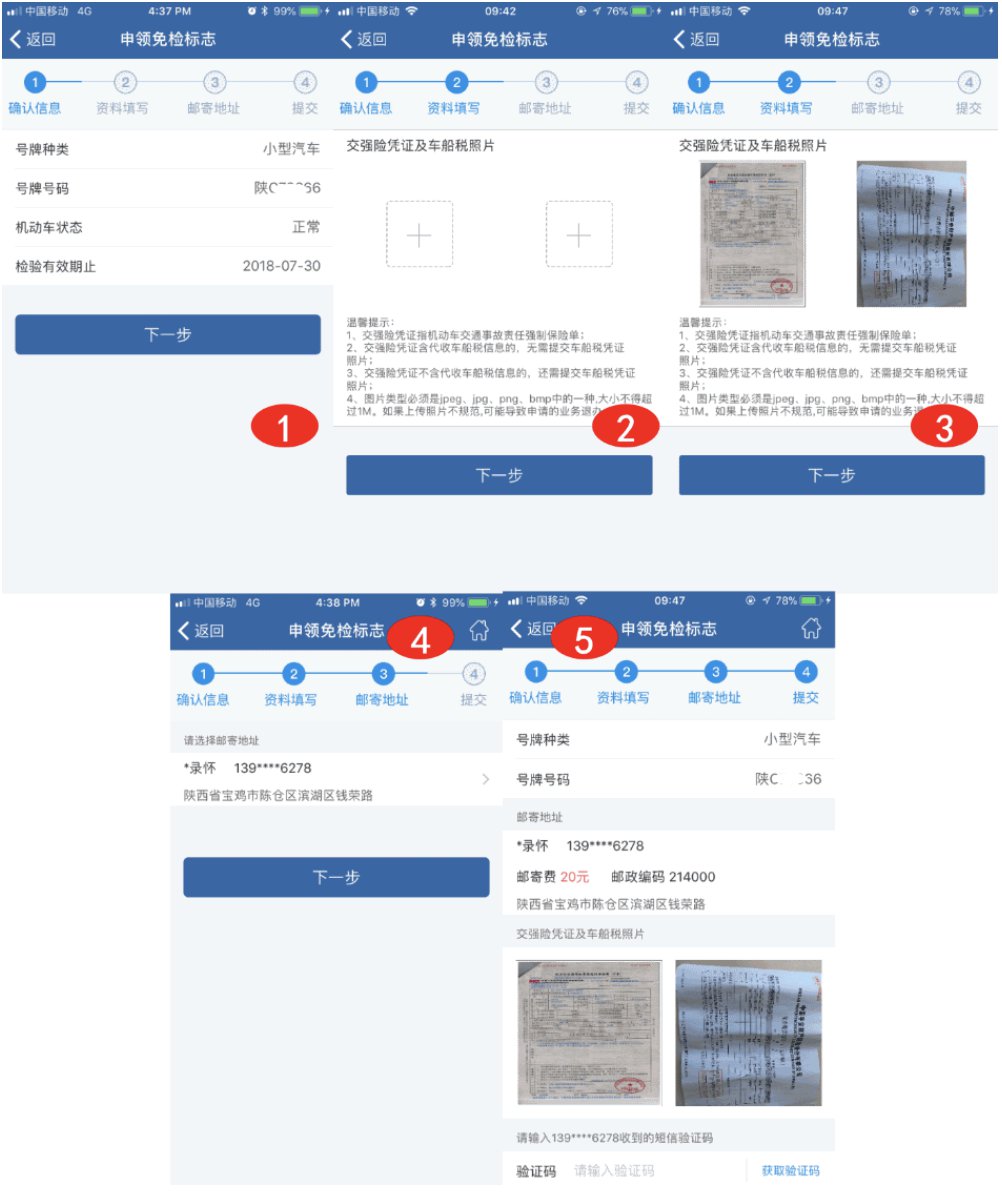 确认车辆信息页面,包括号牌种类、号牌号码、机动车状态、检验有效期止、交强险生效日期、交强险终止日期信息,点击【下一步】进入邮寄地址选择页面,选择邮寄地址后,进入信息确认提交页面,用户再次核对免检车申领检验标志申请信息及邮寄地址,待确认所填资料信息无误后,获取手机短信验证码,核验通过后,点击【提交】按钮,完成免检车申领检验标志业务申请信息提交。