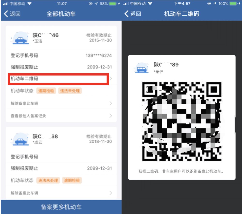 车主用户打开“交管12123”APP,点击首页左上角“机动车”—“全部机动车”,选择待备案的机动车,生成“机动车二维码”。