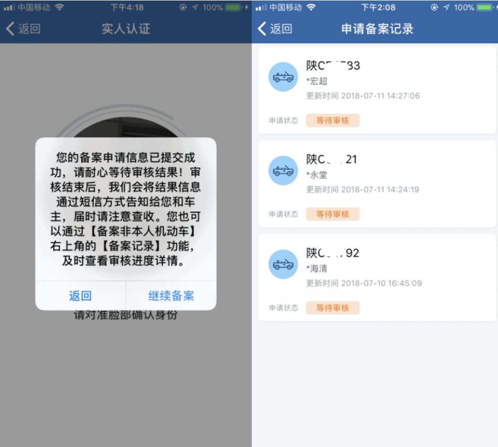 对于未启用公安部可信身份认证或 “实人认证”未通过的,提示用户采集上传 “用户手持身份证或驾驶证照片”。网办中心工作人员将在一个工作日内对备案信息审核确认,审核通过后,系统会将审核结果通过短信或“交管12123”APP消息发送给备案用户和车主。