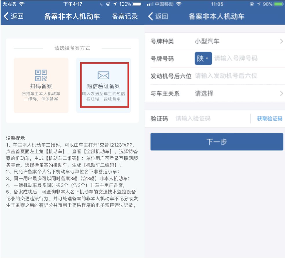 采用“短信验证备案”的,用户输入需要备案的非本人机动车的号牌种类、号牌号码、发动机号后六位等信息后,系统将发送短信验证码至车主手机号码(车主可以是非互联网平台注册用户),申请用户输入车主收到短信验证码。