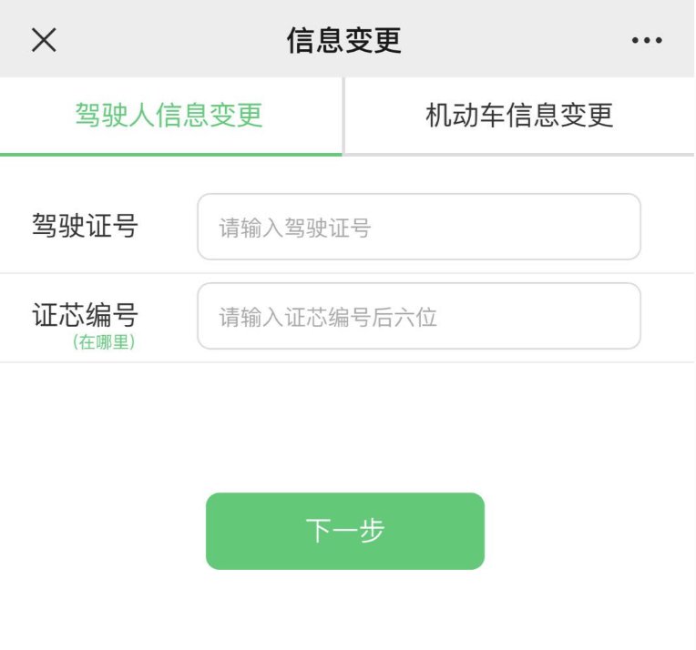 四、输入相关的驾驶证号和证芯编号,点击【下一步】办理信息变更