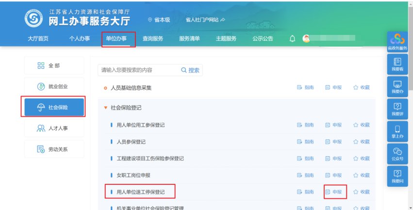 2.点击“社会保险登记”,点击“用人单位退工停保登记”对应的【申报】按钮