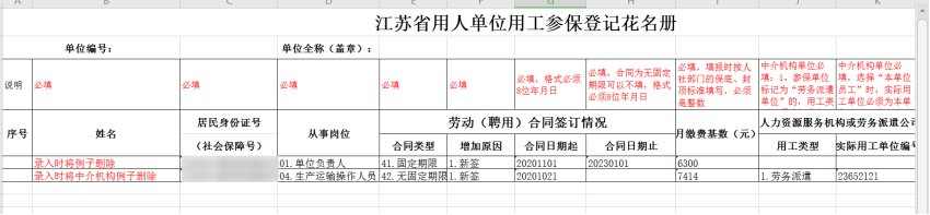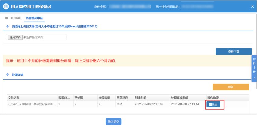 7.在模板上维护需要导入的人员用工信息,点击【选择文件】按钮,选择需上传的模板,点击确认提交,完成业务办理。