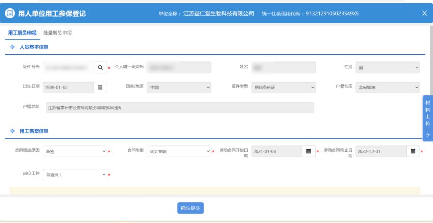 5.点击【确认提交】,完成人员用工参保登记业务办理。