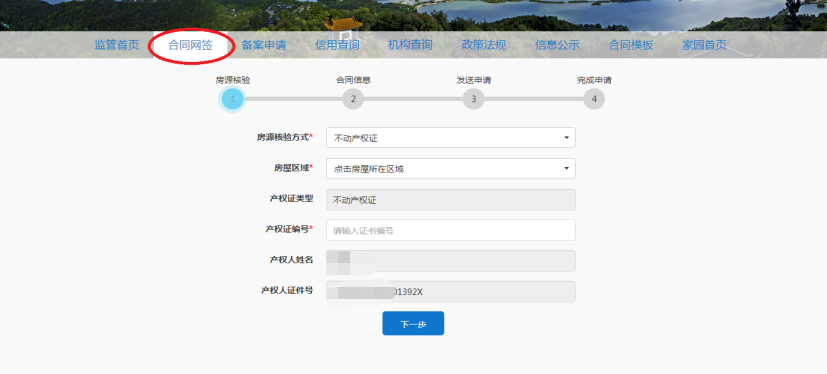 出租人完成上述实名认证注册并登录后,点击“合同网签”进入受理界面,其中房屋核验方式分为不动产权证、房屋所有产权证和商品房备案合同,选择一种方式并填写其中的空白内容,完成后点击“下一步”: