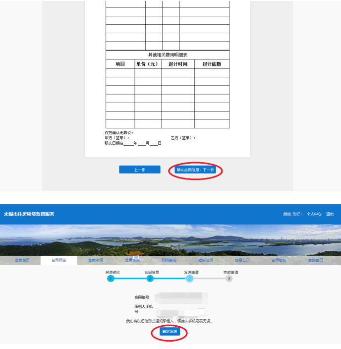 点击“编辑”,进入合同信息预览,“确认合同信息,下一步”,,进入“发送申请”环节: