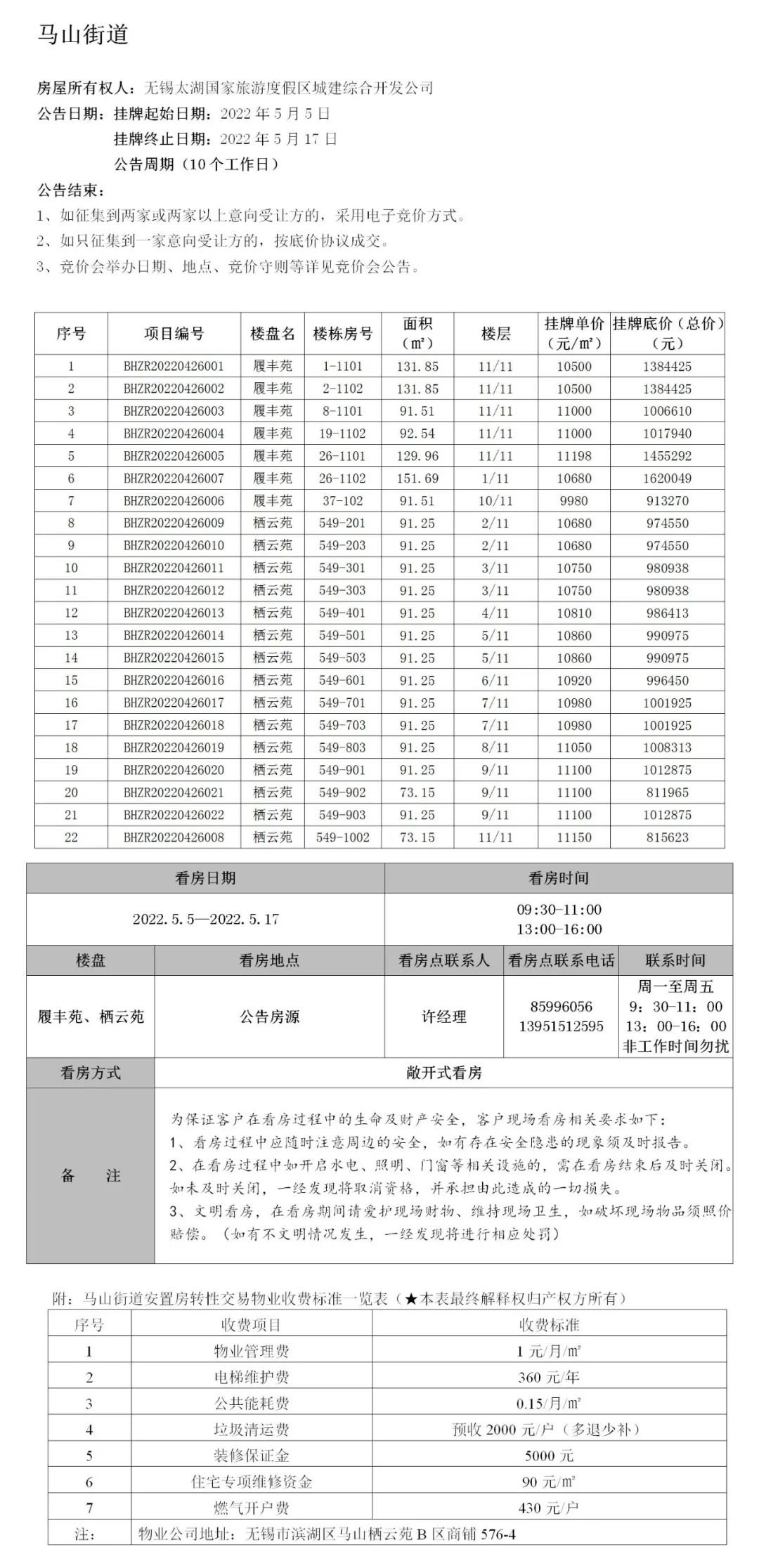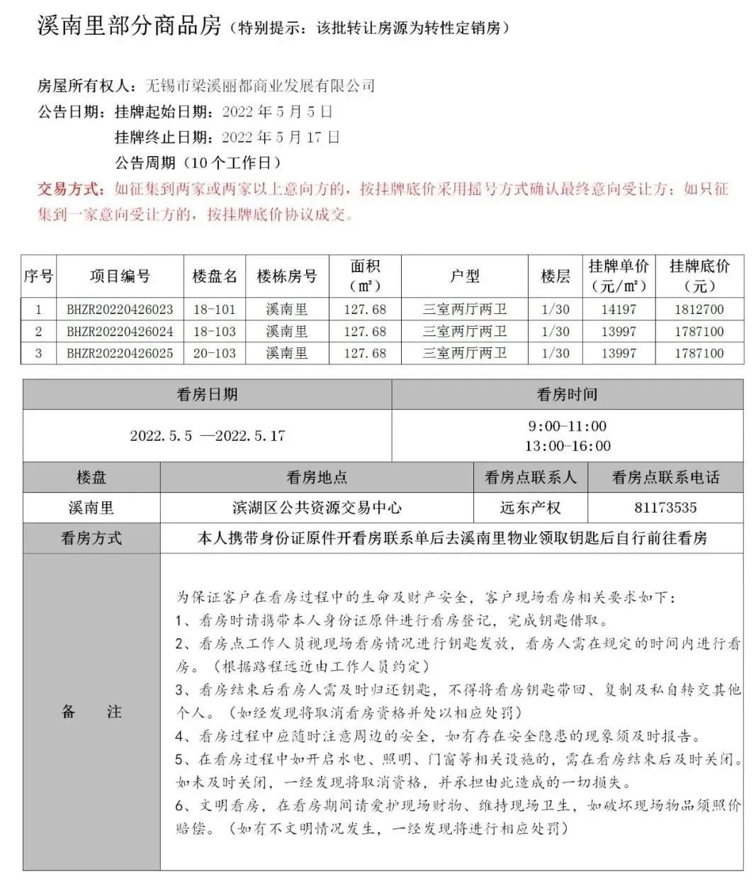 为在疫情防控常态化条件下进一步确保咨询看房、报名交保工作的安全、高效、有序进行,本次公告在无锡市滨湖区公共资源交易中心官网和无锡远东产权交易中心官网发布,公告期间请至无锡市滨湖区公共资源交易中心远东产权窗口办理报名手续,务必提前预约,预约电话:0510-81173535,感谢各位意向受让方的理解与支持!同时为了守护您和工作人员的健康,请各位意向受让方看房、报名时务必携带身份证原件,自觉佩戴口罩,配合工作人员做好体温检测和信息登记,并核验“门铃码”、“行程码”及48小时核酸阴性报告,其它事项按照无锡市疫情防控通告严格执行,感谢您的配合!