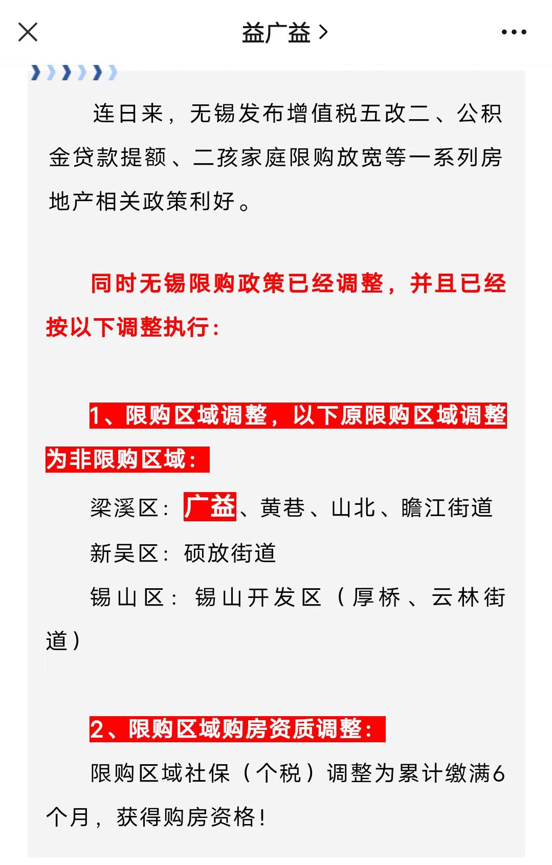 根据网络媒体,以及广益街道办事处官方微信:调整梁溪区(不含广益、黄巷、山北、瞻江街道)、滨湖区(不含马山、胡埭)、新吴区(不含鸿山、硕放街道)、惠山新城和锡东新城(不含锡山开发区)范围内限购政策。(以上信息官方未公布公告,仅供参考,如有公告发布,本站及时更新)