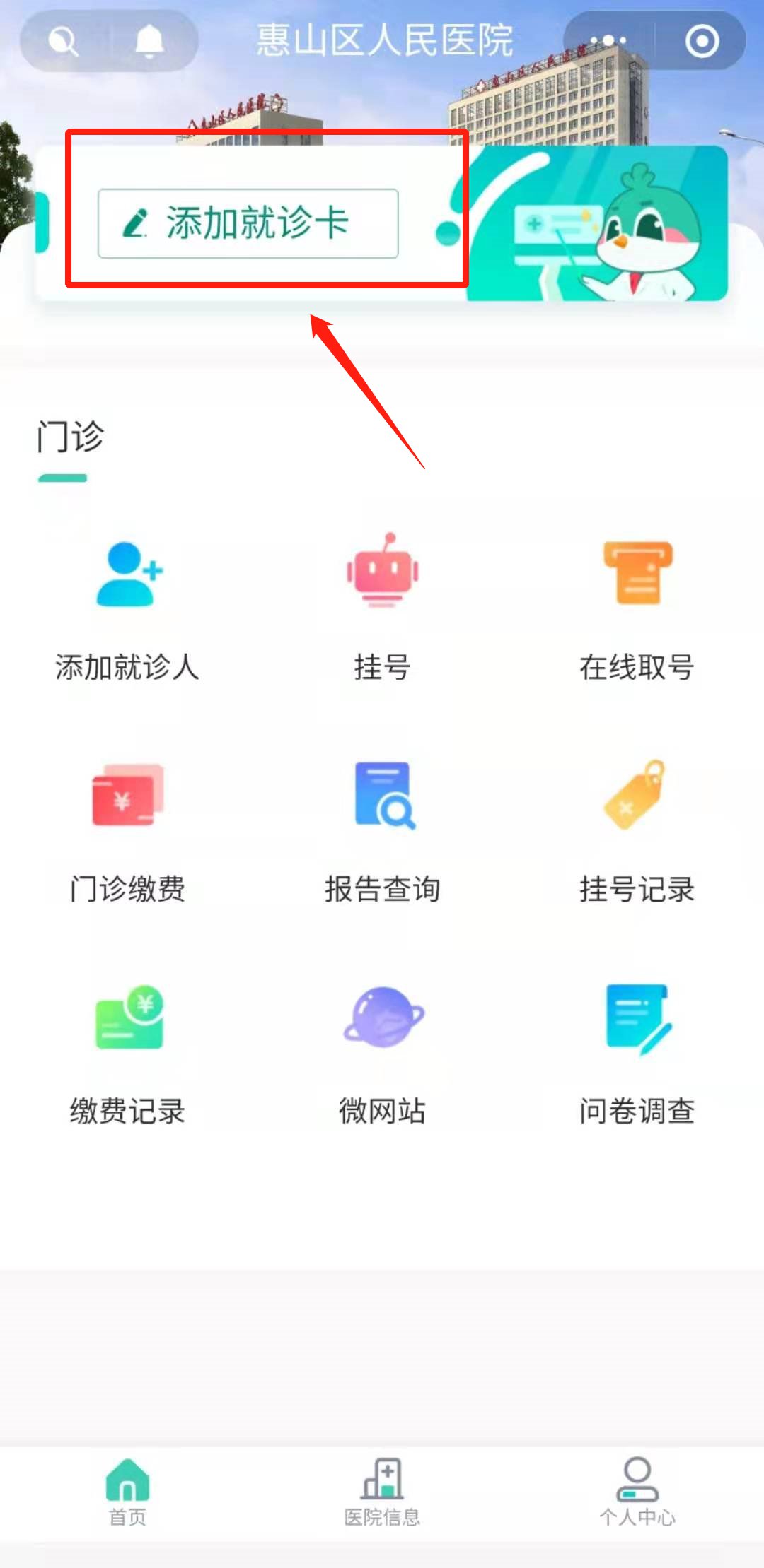 3、选择“添加就诊卡”,完善个人信息