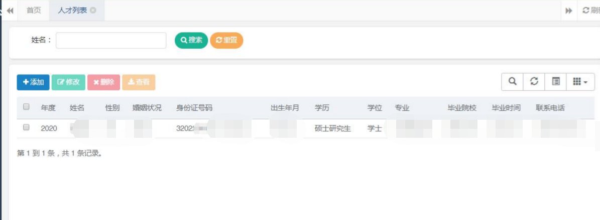 2、点击首页【人才登记】图标,进入人才列表页面