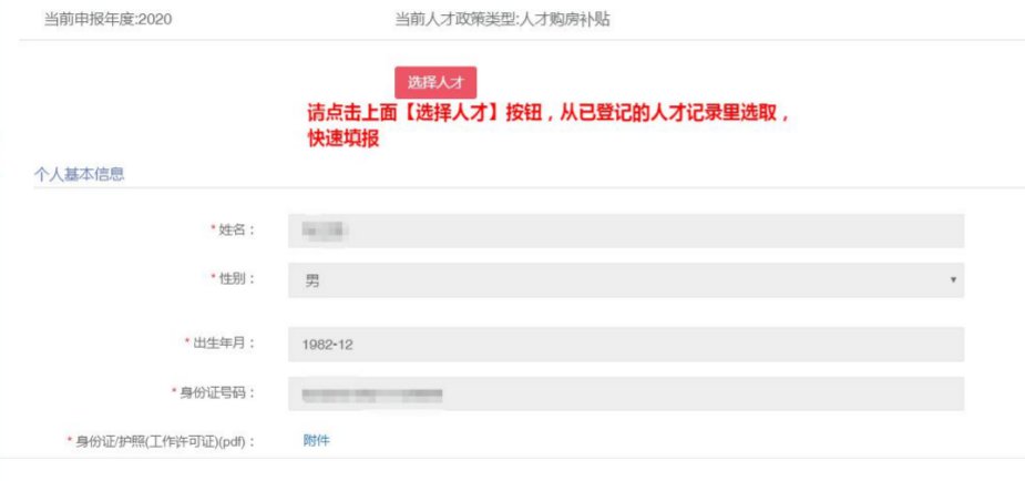 选中后,点击【确认】按钮,该人才基本信息即可在申报页面显示,申报页面灰色部分内容只能从人才登记的基本信息引入进来,不能直接填写,白色部分内容需手动填写