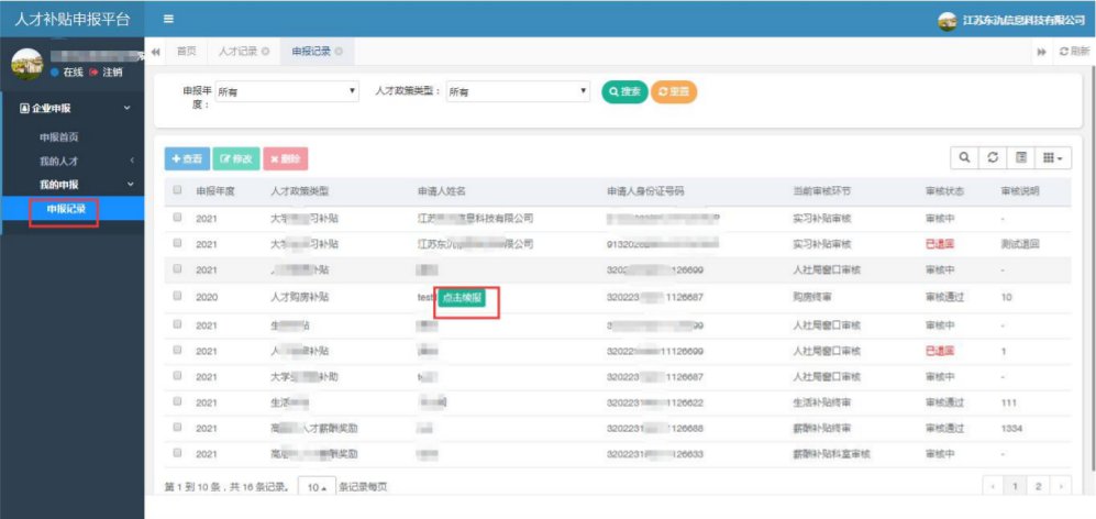 情形三:续报(第二年或第三年申报)点击左侧【企业申报-我的申报-申报记录】菜单,进入申报记录列表页面