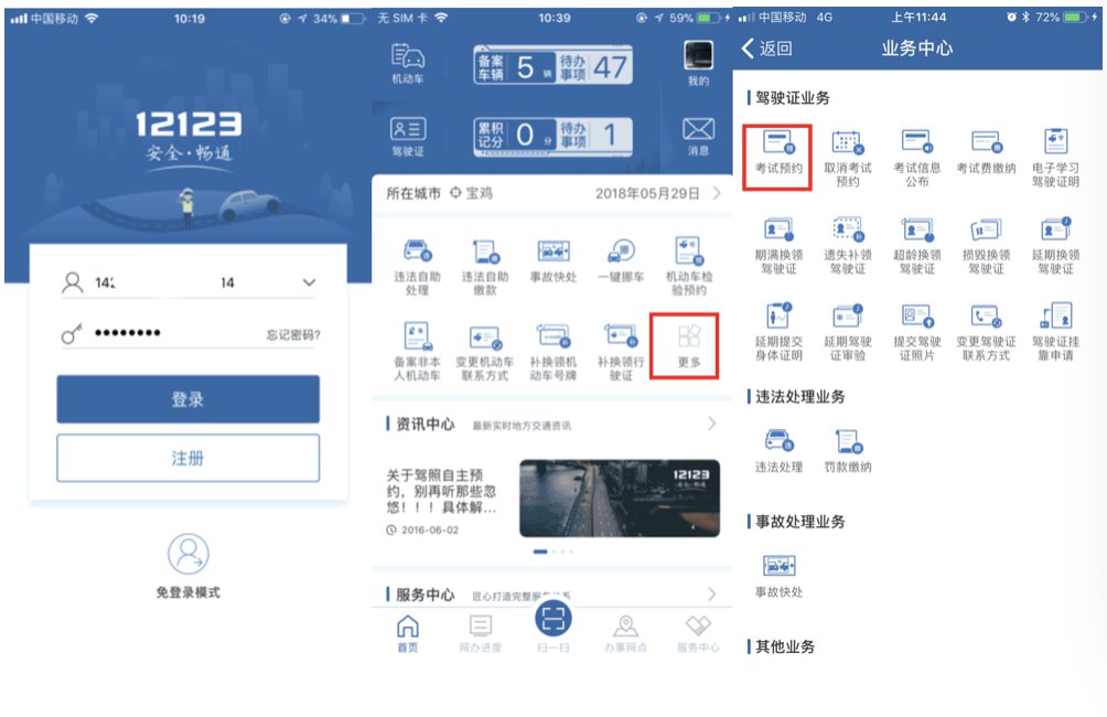 1、登录“交管12123”APP后,通过【业务中心】→【考试预约】,进入考试预约业务流程。