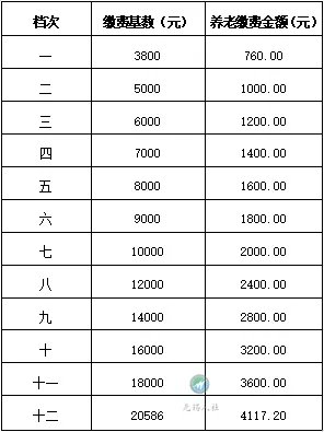缴费基数:共12个档次,分别为3800元、5000元、6000元、7000元、8000元、9000元、10000元、12000元、14000元、16000元、18000元、20586元。
