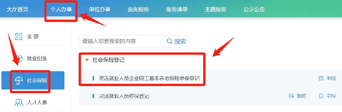 申请人通过登录“江苏省人力资源和社会保障网上办事服务大厅”首页(https://rs.jshrss.jiangsu.gov.cn/index/),办理实名注册认证,选择“个人办事”-“社会保险”-“灵活就业人员企业职工基本养老保险参保登记”,点击“申报”进行参保登记。