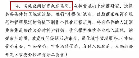 实施夜间消费包容监管。在控量基础上统筹研究,选择具备条件的区域或道路,推行“外摆位”试点。鼓励商家在符合规范和管理规定的前提下制作个性化店招店牌,将有条件的人流消费密集道路改为分时制步行街。优化微型餐饮企业准入流程,缩短审批时限,放宽夜间促销活动审批,强化城市管理服务。(市城管局牵头,市公安局、市市场监管局,各区人民政府、无锡经济开发区管委会按职责分工负责)