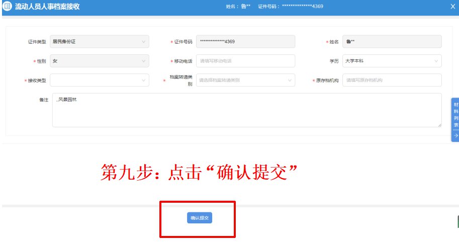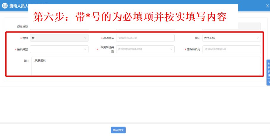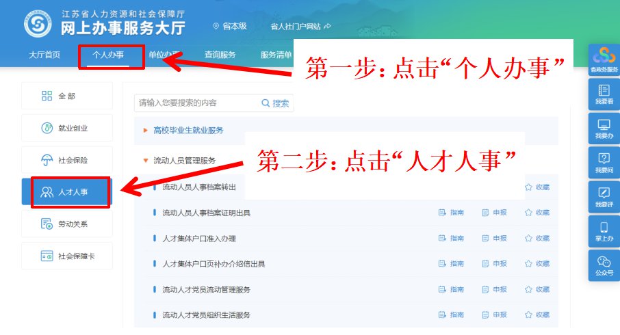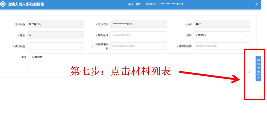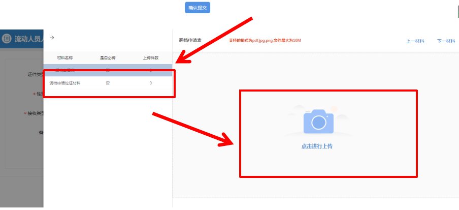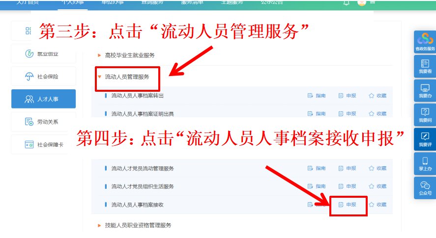 流程:点击个人办事——人才人事——流动人员管理服务——流动人员人事档案接收申报——选择推送人才中心——点击保存——按实填写内容——点击材料列表——上传身份证、户口簿首页与本人页、毕业证书(若选择就业调入档案,需提交在无锡就业的劳动合同)——确认提交